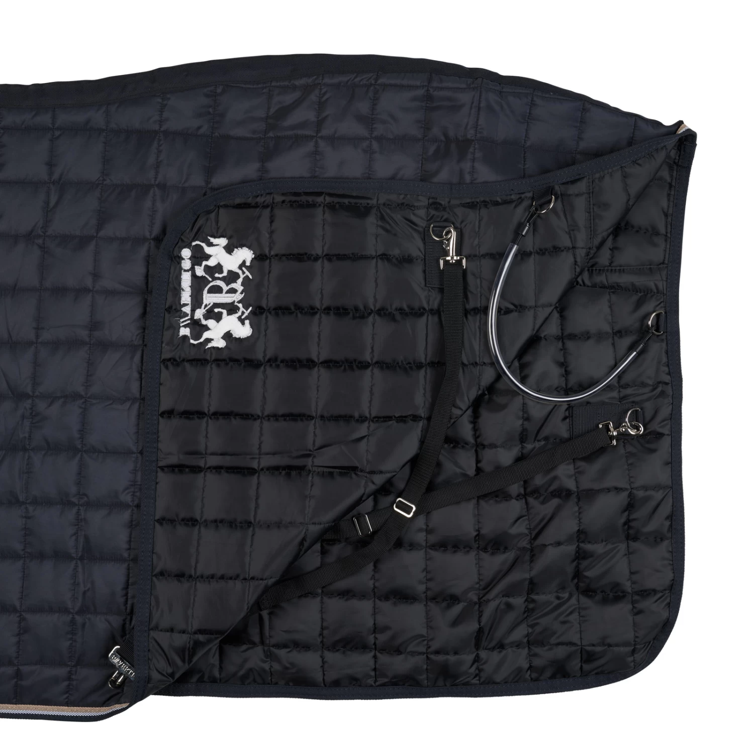 Hülle dein Pferd in unsere hochwertige B Vertigo Mason Führanlagendecke. Der weiche Kunstfellkragen und die elegante Steppung sorgen für einen stylischen Look und sind außerdem super bequem. Die Decke kann sicher mit Frontverschlüssen und Kreuzbegurtung befestigt werden. Eine kleine Stickerei an der Hinterseite bringt dieser Decke einen Hauch Glamour.