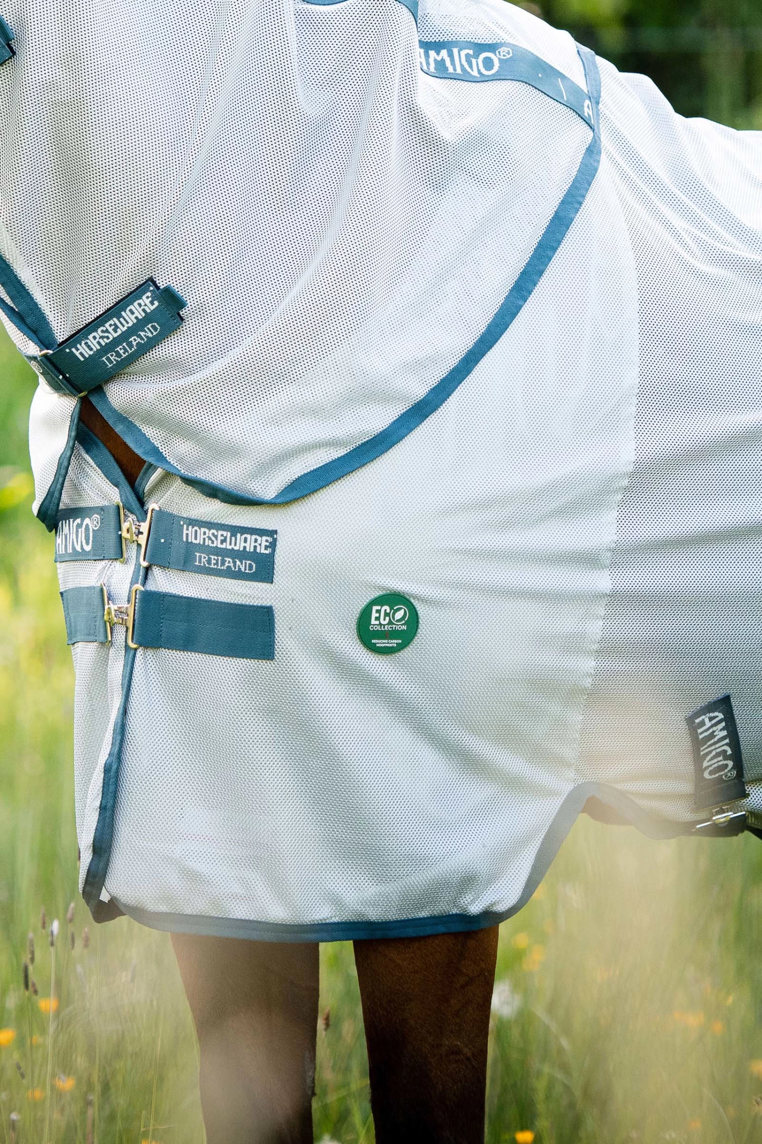 Die erste Bug Rug von Horseware, die auc recycelten Plastikflaschen hergestellt wird. Vordere Beinausschnitte, klassischer Frontverschluss, seidiges Schweif-, Schulter- und Mähnenfutter, Kreuzgurte, abnehmbare Halsdecke und silberne Farbe, um das Sonnenlicht zu reflektieren.