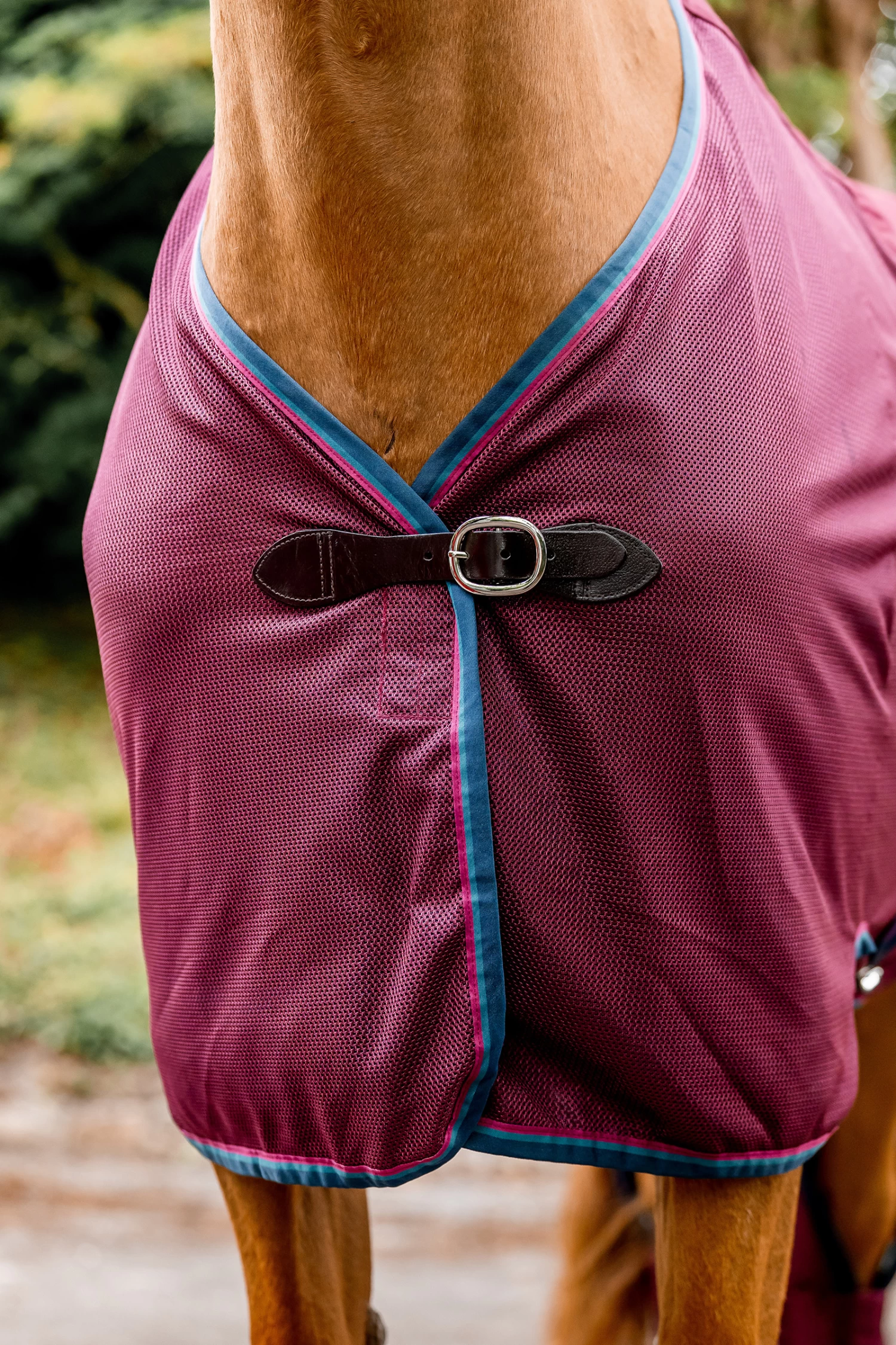 Höchsten Komfort zu bieten. Der obere Teil der Decke ist konturiert geschnitten und abgesteppt. Dies bietet feuchtigkeitsregulierende Eigenschaften und hält den Pferderücken während des Transports warm. Die Seiten aus perforierten Netzmaterial bieten maximale Luftziruklation, um ein Überhitzen zu vermeiden.