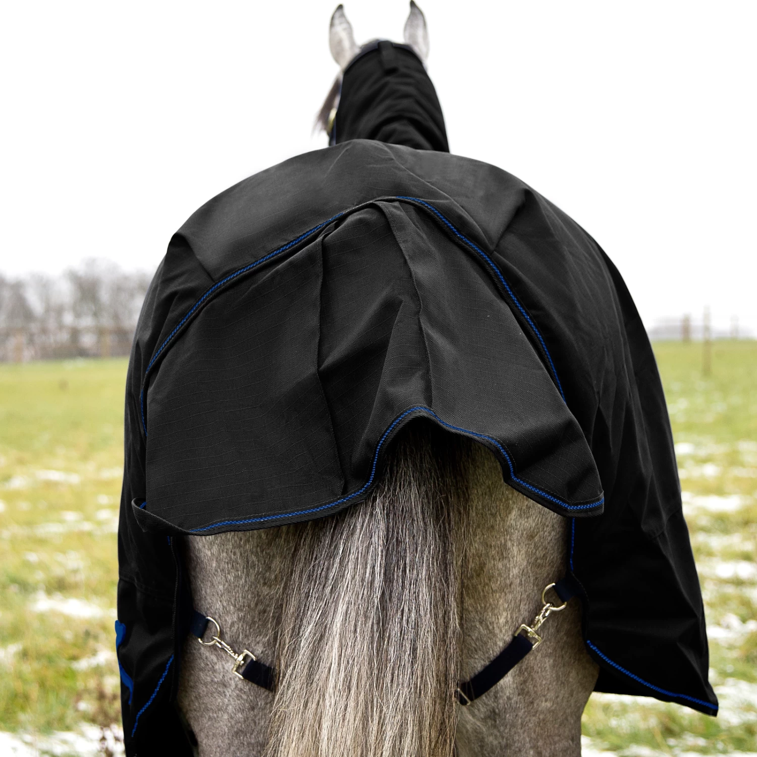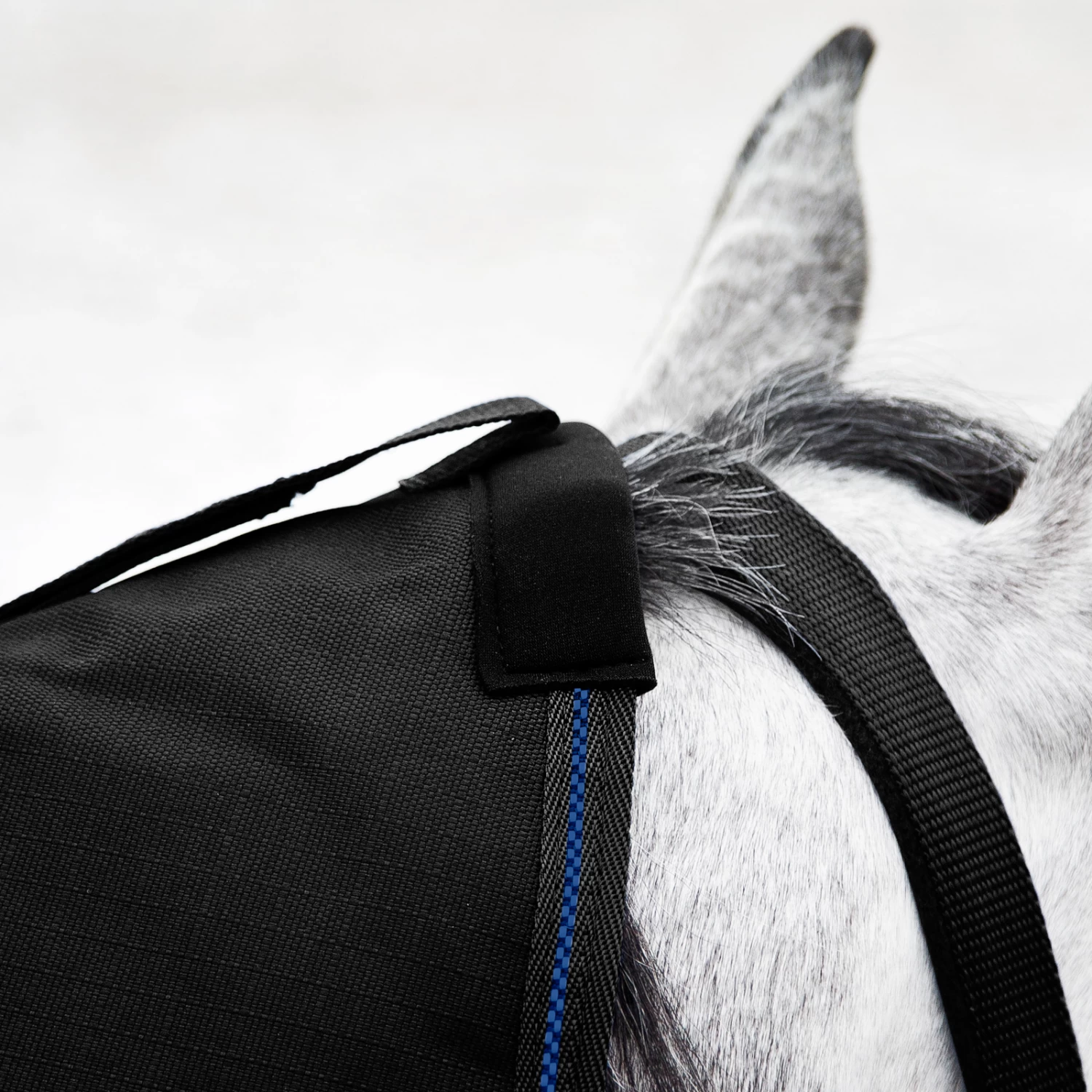Die Horze Avalanche Combo Übergangsdecke ist eine optimale Lösung bei Regen. Am wasserdichten Halsteil befinden sich Schlaufen für einen festeren Halt und das Anbringen von Zügeln. Die Combo Decke schützt das Pferd vom Genick bis zum Schweif. Durch großzügige Gehfalten hat das Pferd die volle Bewegungsfreiheit. Das Außenmaterial besteht aus robustem 1200D Polyester RipStop, welches auch nach langem Tragen die Form behält. Horze garantiert, dass bei drei Wäschen die wasserdichten und atmungsaktiven Eigenschaften erhalten bleiben. Die Combo Regendecke eignet sich besonders gut bei wechselhaftem Wetter in der Übergangs-Saison.