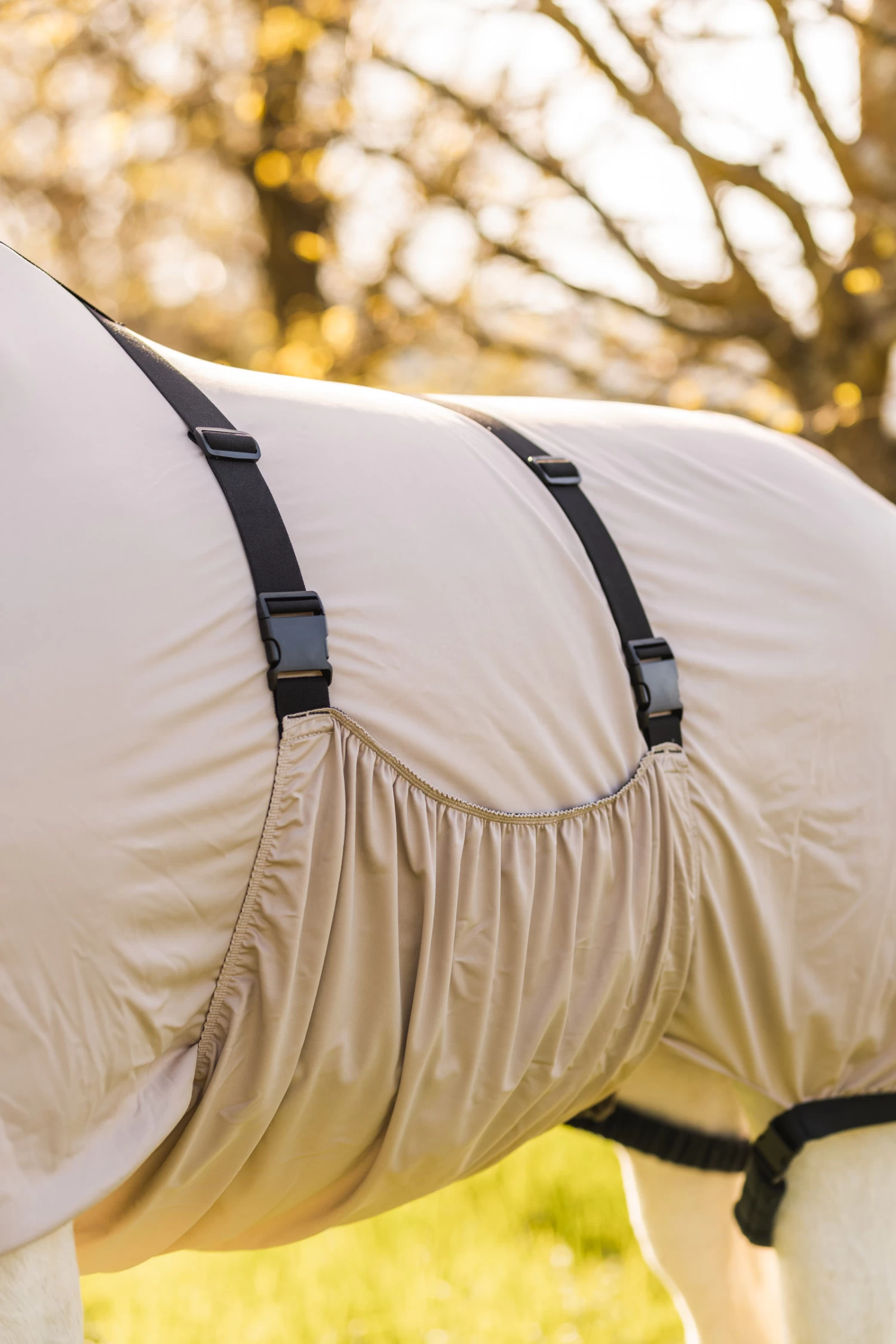Dieser Horze Ekzemerdecke bietet hervorragenden Schutz gegen Fliegen und Sonne, da sie den ganzen Körper außer den Beinen bedeckt und für ein ruhigeres und glücklicheres Pferd sorgt. In Kombination mit der passenden Fliegenmaske (Artikel # 22812), die separat verkauft wird, für kompletten Schutz. Die Horze Ekzemerdecke ist wie ein Schutzanzug für Ihr Pferd, um vor den blutrünstigen Fliegen im Sommer zu schützen. Das Gewebe ist leicht und atmungsaktiv, hält Plagegeister ab, während viel Belüftung ermöglicht wird, damit Ihr Pferd in Ruhe grasen kann. Das Halsteil wird am Halfter befestigt und um den Look zu komplettieren, bringen Sie noch die Fliegenmaske an, damit Ihr Pferd vor den Plagen des Sommers komplett geschützt wird.