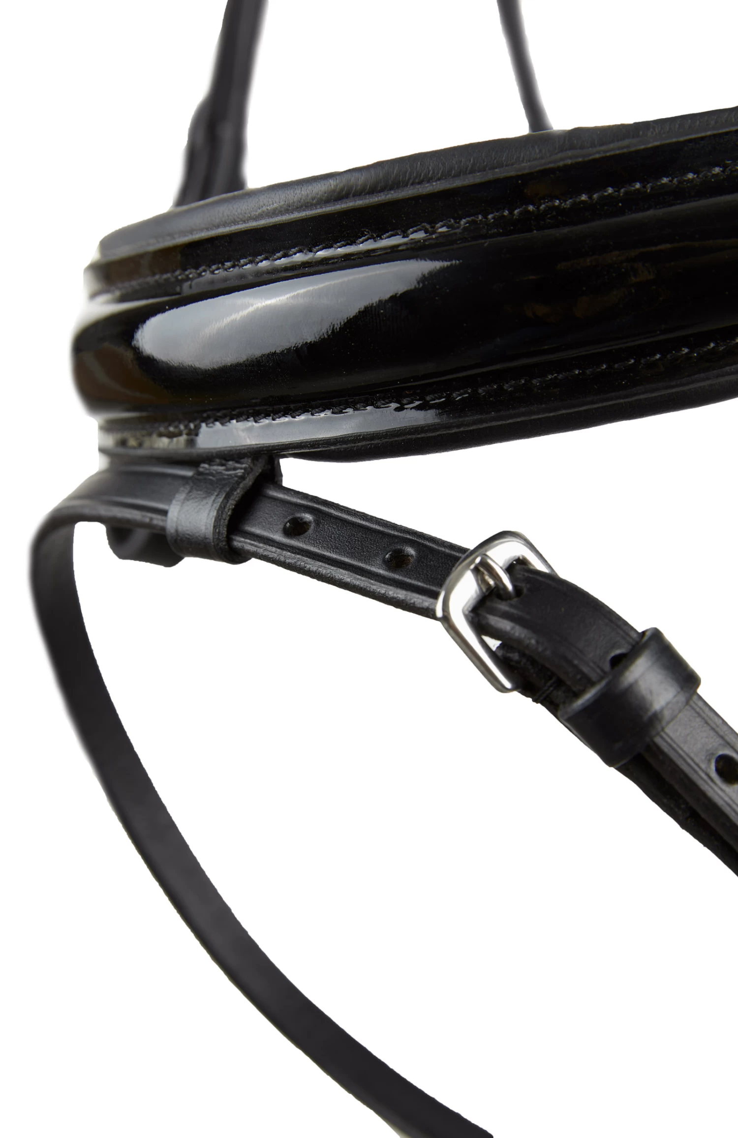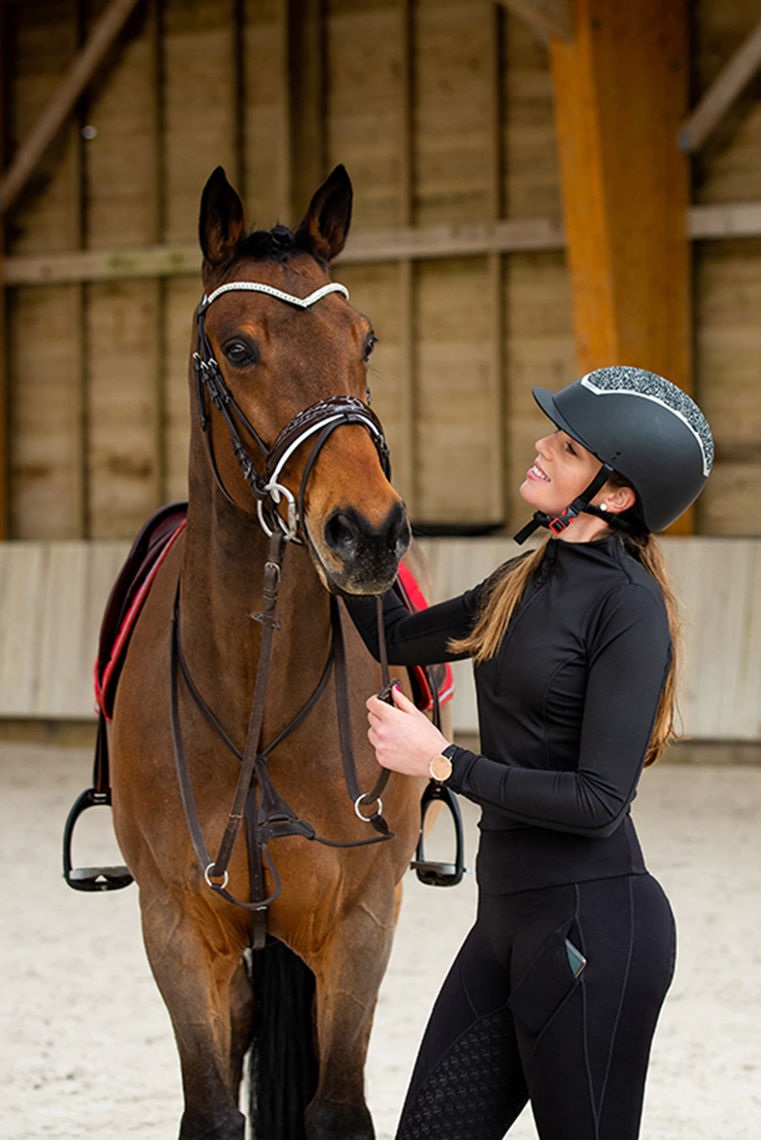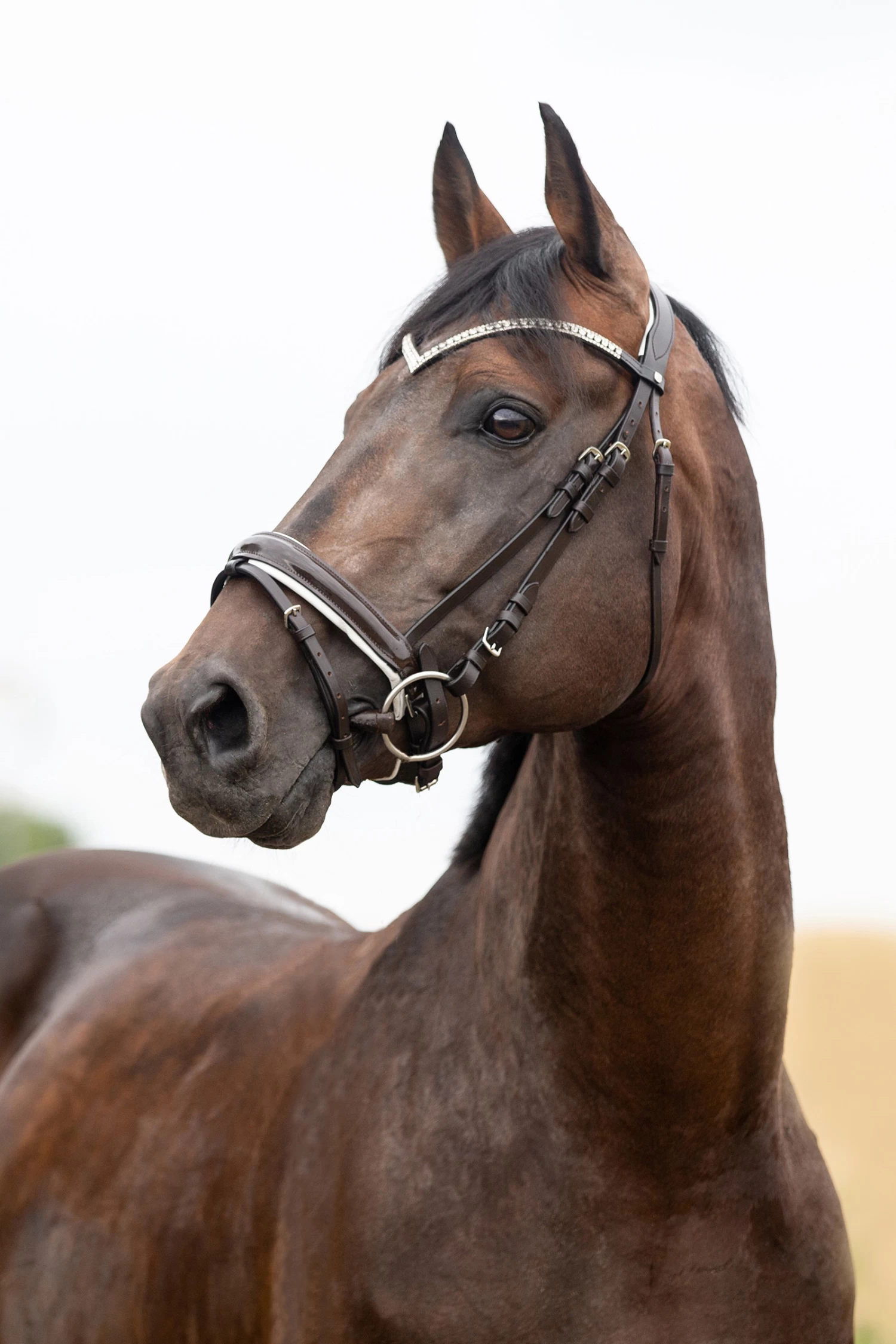 Das unterlegte Zaumzeug für die Dressur sieht wunderschön aus und passt perfekt. Die weiche Polsterung mit anatomisch geformten Ausschnitten für die Ohren sorgt für Komfort und eine bessere Passform. Die gepolsterte Umlenkverschnallung ist einfach zu handhaben. Der schöne V-förmige Stirnriemen mit einer glänzenden Reihe Strasssteine sorgt für ein wenig Glitzer.