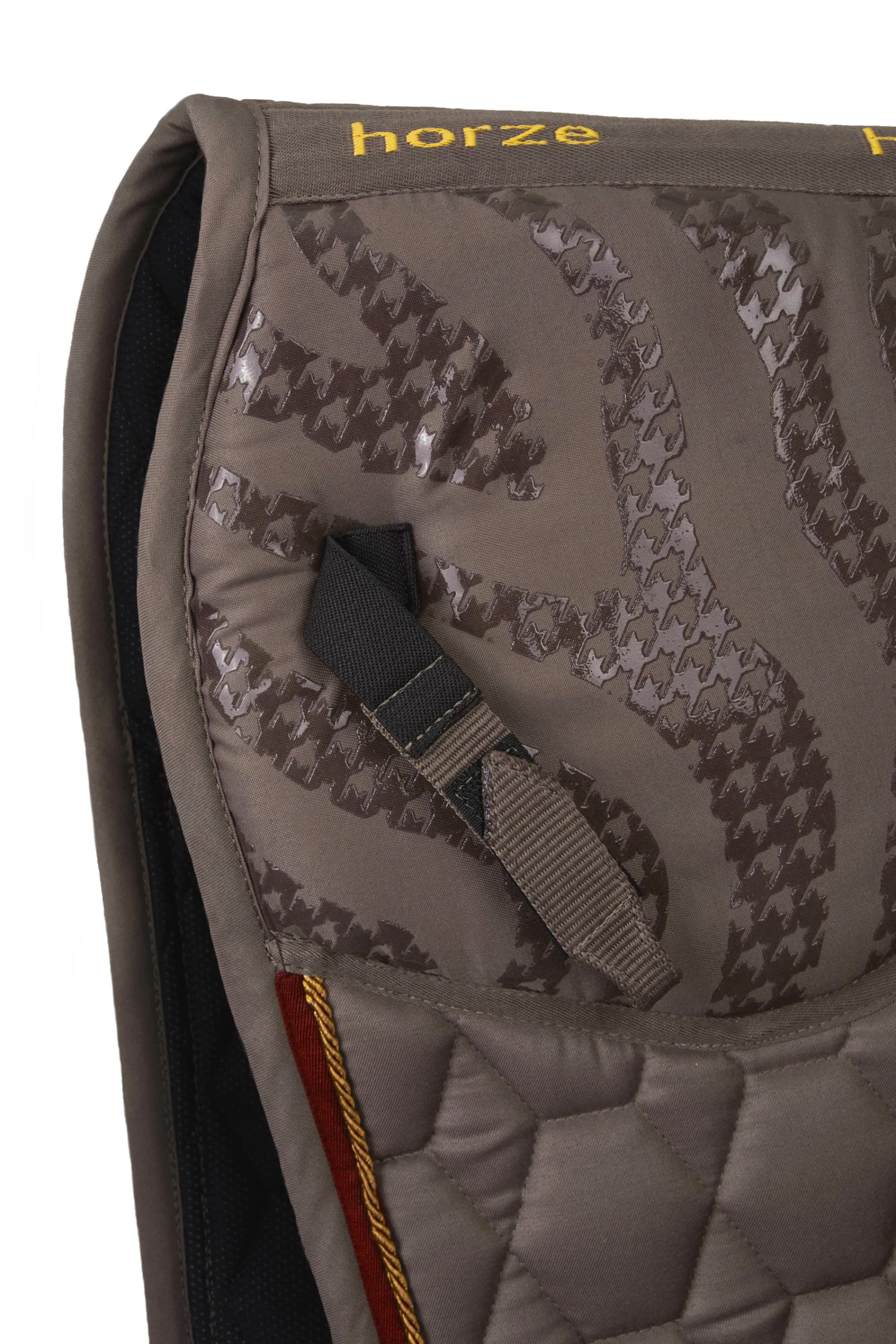 Die anatomisch geschnittene Horze Kenya Schabracke ist mit einem Silikondetail ausgestattet, das ein Verrutschen des Sattels verhindert. Eine leichte Polsterung unterhalb des Sattels sorgt für zusätzlichen Komfort. Das feuchtigkeitsableitende Futter hält den Rücken deines Pferdes trocken. Drei Paspelreihen und das zeitlose Design sorgen für einen klassischen Look. Metallic-Details sorgen für einen eleganten Look. Kombiniere diese Schabracke mit dem Rest unseres Horze Kenya-Sortiments, um ein komplettes Outfit zu erhalten.