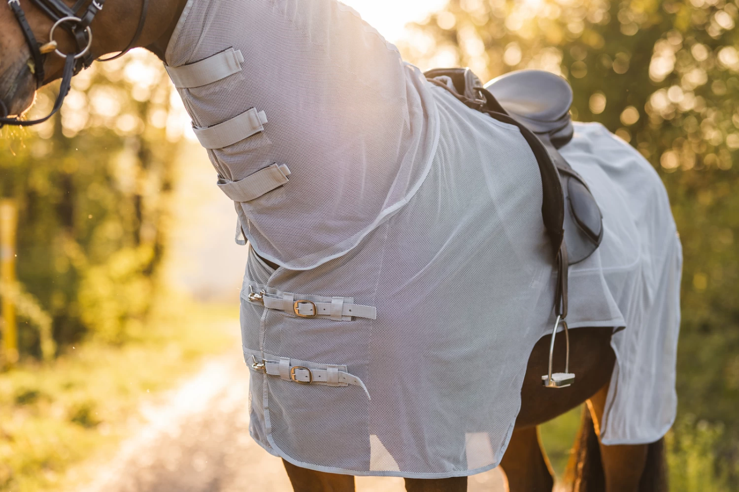 Reite mit dieser schönen Fliegendecke mit Komfort, ohne dich von lästigen Fliegen stören zu lassen. Die Reitdecke dient zum Schutz der Nieren und der Hinterhand sowie des Nackenbereichs, ohne die Bewegungsfreiheit des Pferdes einzuschränken.
