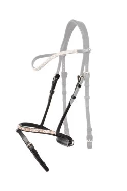 Die englisch-kombinierte Dressurtrense „Juliana“ KavalSH4 überzeugt nicht nur durch ihr schickes Aussehen, sondern auch durch höchsten Tragekomfort: Das Genickstück hat im Ohrenbereich ein Gelpadding, das besonders weich und anschmiegsam ist. Durch das weiche Padding wird der Druck im empfindlichen Ohrenbereich gedämpft. Zusätzlich hat das Genickstück eine anatomische Form, um den Ohren genügend Freiheit zu geben. Der Nasenriemen ist weich unterlegt und schmal zulaufend. Das Stirnband in seiner geschwungenden Form und den großen weißen Strasssteinen sieht an jedem Pferdekopf absolut schick aus. Der Trensenzaum wird mit schmalen Zügeln geliefert.