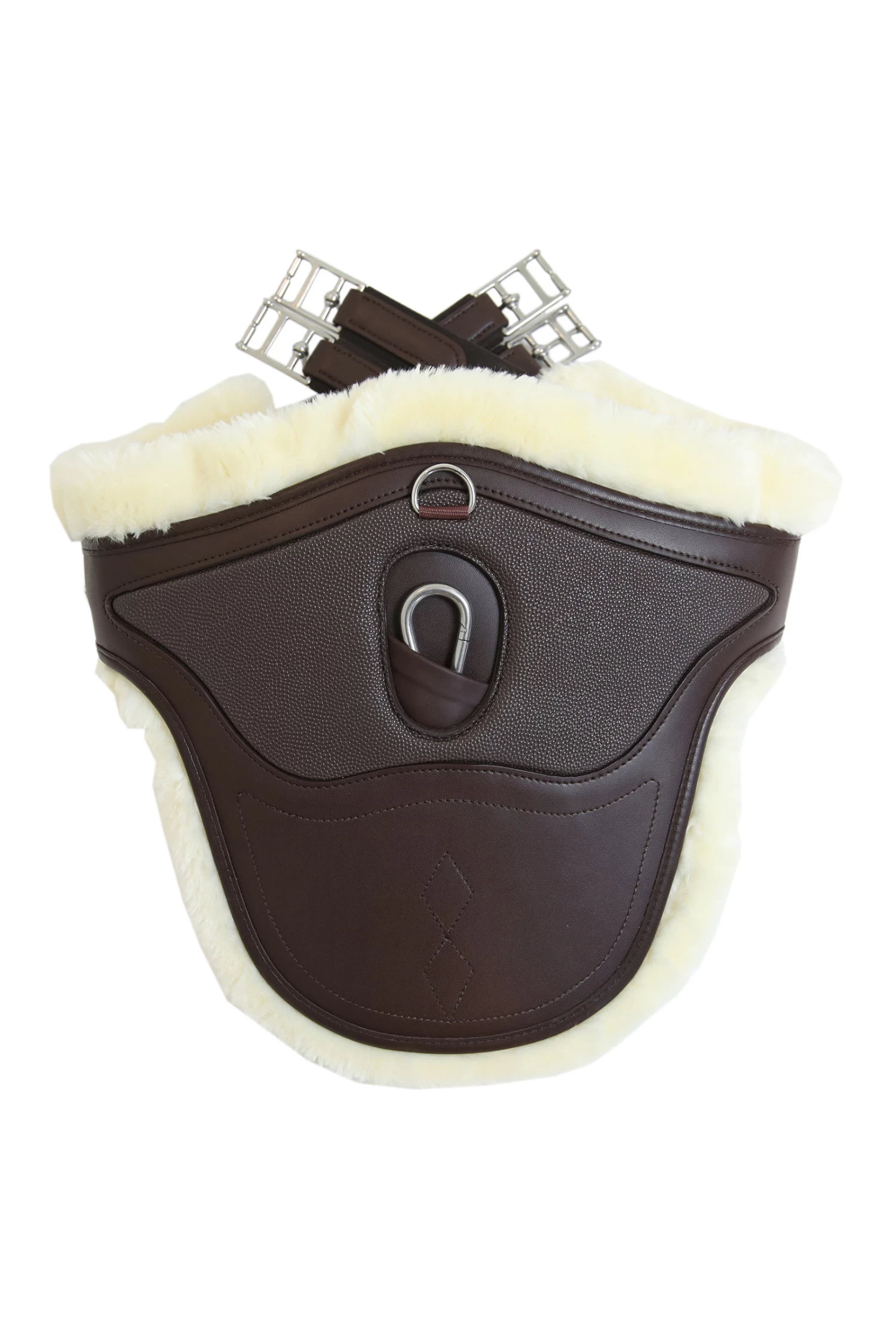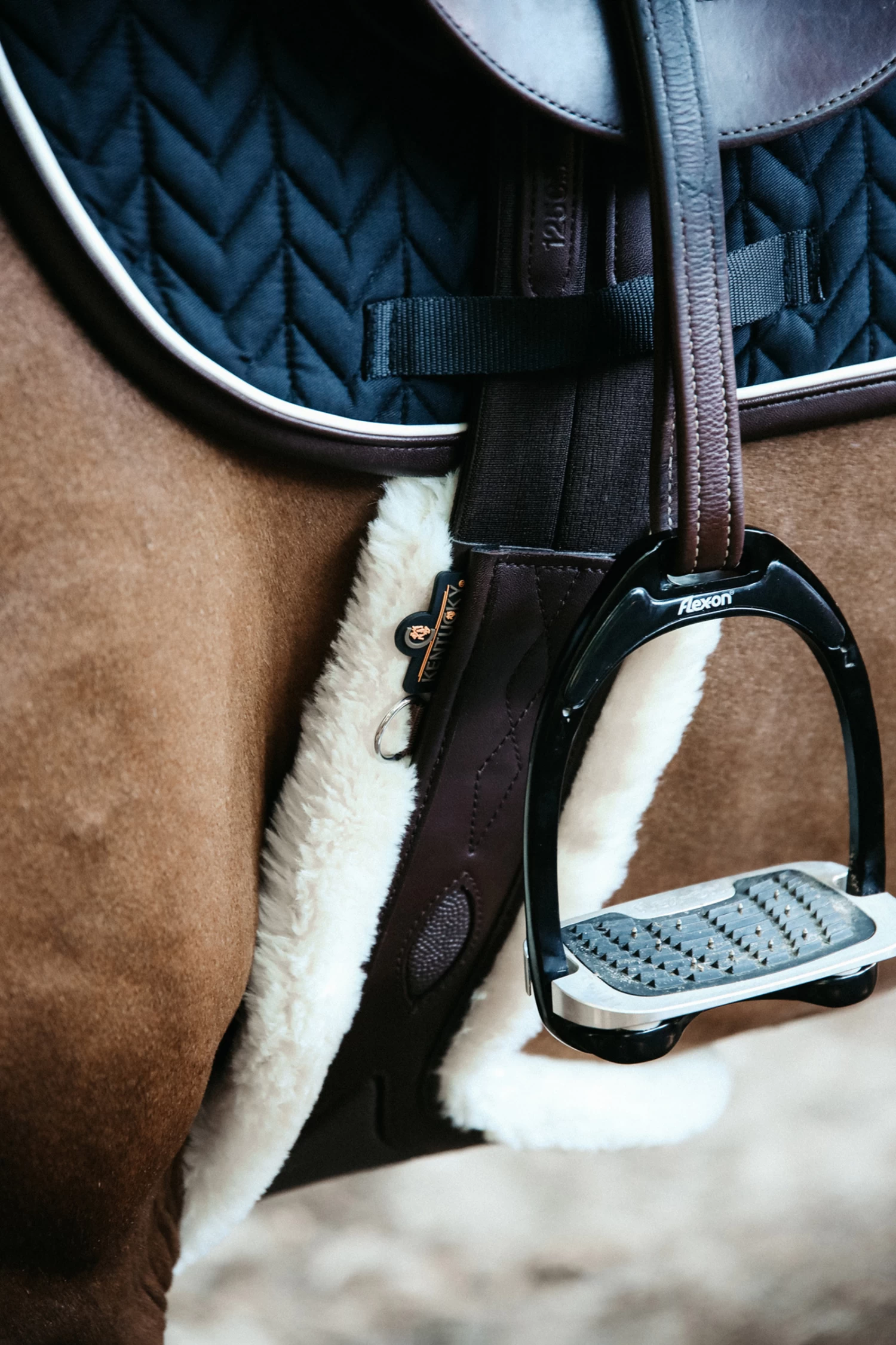 Zusätzlich zur breiten, schützenden Platte ist der Stollengurt Schaffell Spezial anatomisch geformt. So bietet er Komfort und Sicherheit beim Springen und begrenzt gleichzeitig das Risiko von Verletzungen durch Hufeisen oder Stollen. Dabei ist er speziell so geformt, dass er der natürlichen Bewegung des Pferdes folgt und Schulter-und Vorderfußwurzelgelenke entlastet. Die Stollengurt Schaffell Spezial hat ein PVC Basketball Design, das ihm einen sehr originellen und herausstechenden Look verleiht.Der Gurt hat ein Inneres aus schützendem EVA, Gummizüge an beiden Enden zur Verteilung des Drucks sowie drei D-Ringe zum Anbringen von Hilfszügeln und eine Schnalle zur Befestigung des Vorderzeugs. Die Gummibänder sind belastbar und bleiben fest, da sie aus drei doppelten Lagen gefertigt sind. Das künstliche Schaffell bietet hervorragende Polsterung für empfindliche Haut und ist genauso wie das Kunstleder sehr pflegeleicht, denn beide können auch bei 30° in der Waschmaschine gereinigt werden (ohne Trockner). Dank des Klettverschlusses auf der anderen Seite des Schaffellbezugs lässt sich dieser leicht abnehmen und wechseln. Der Stollengurt Schaffell Spezial ist aus Kunstleder gefertigt, das weder Schmutz, Schweiß noch Wasser aufnimmt und somit sehr langlebig ist. Außerdem ändert es seine Farbe nicht und kann nur schwer beschädigt werden.