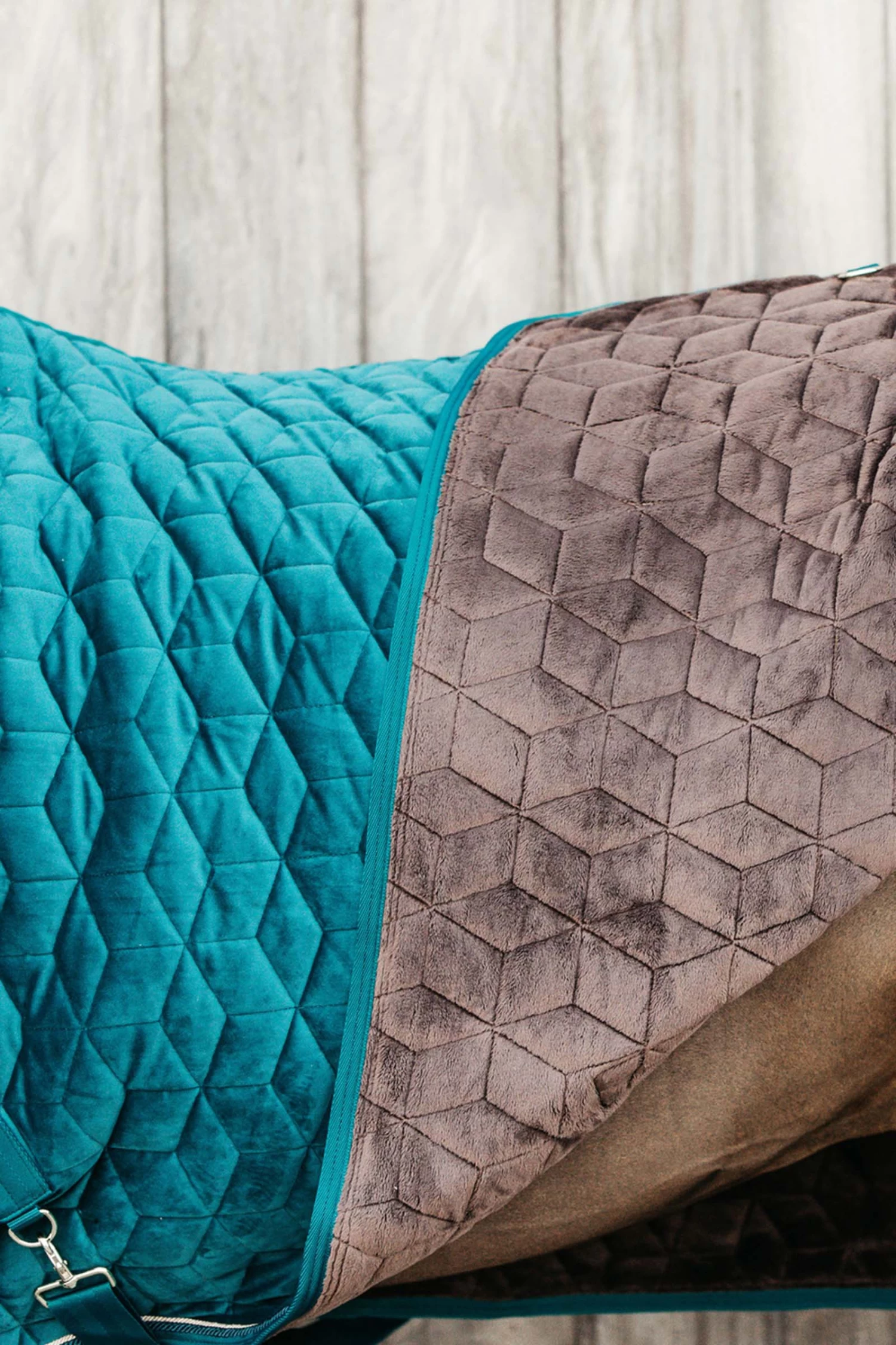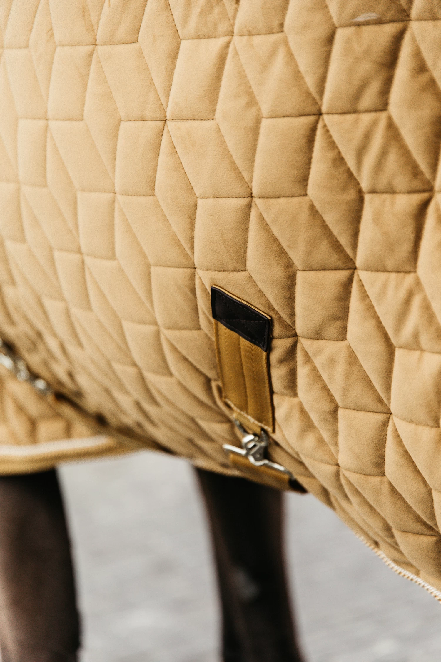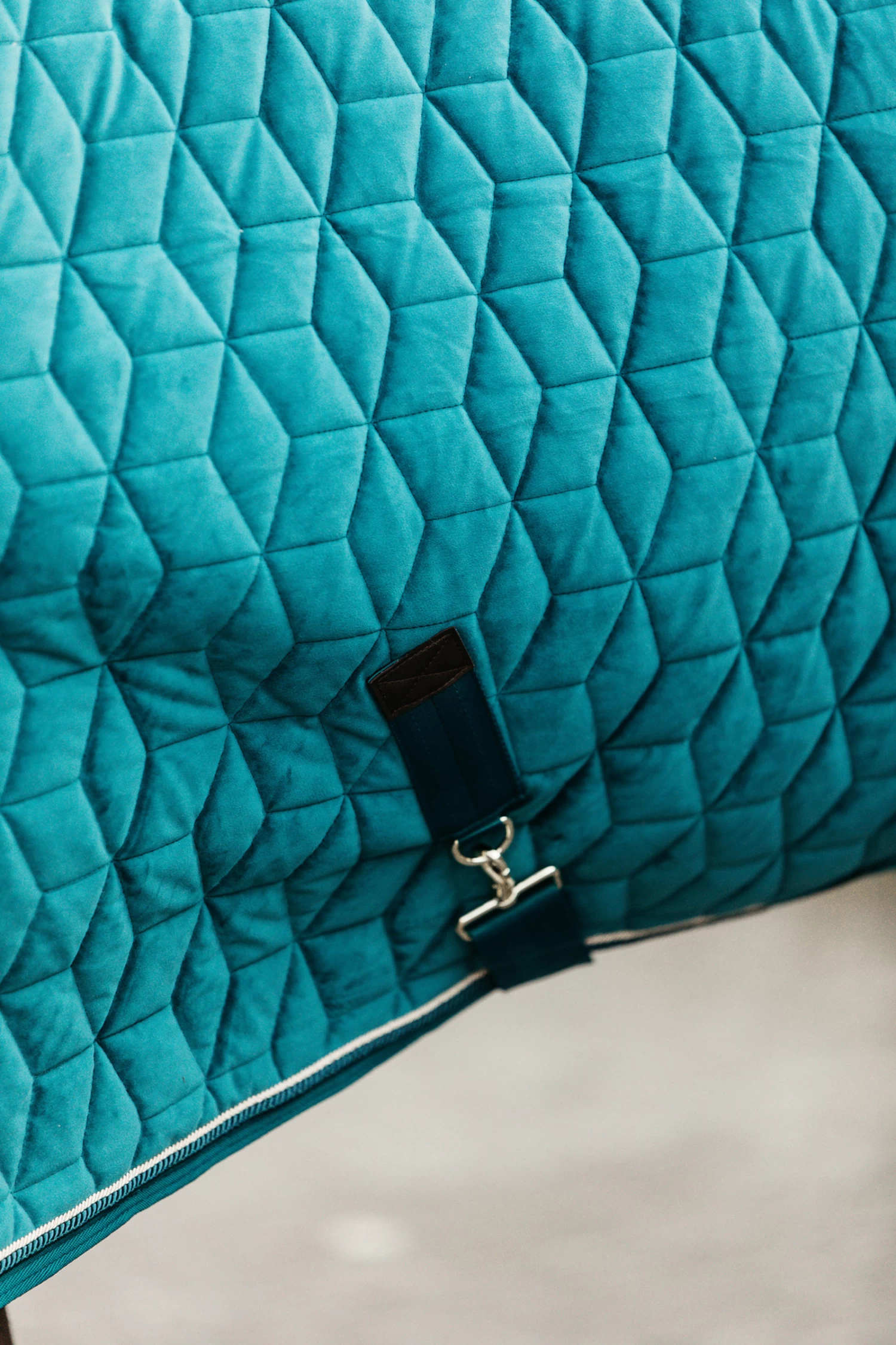 Mit der Turnierdecke Velvet wirst du im Stall sicher auffallen. Die Decke ist mit 160g gefüllt und eignet sich im Winter perfekt als Stalldecke zu Hause oder beim Turnier. Die Außenseite der Decke ist aus einem weichen und schicken Samtstoff und einer raffinierten Steppschicht. Die Würfel-gesteppte Schicht macht es Pferden schwer, die Decke zu zerbeißen. Die Innenseite der Decke ist mit künstlichem Kaninchenfell ausgekleidet, das Scheuern verhindert. Das künstliche Kaninchenfell erzeugt auch winzige Lufteinschlüsse, die eine Isolierschicht um dein Pferd bilden und es extra warm halten.