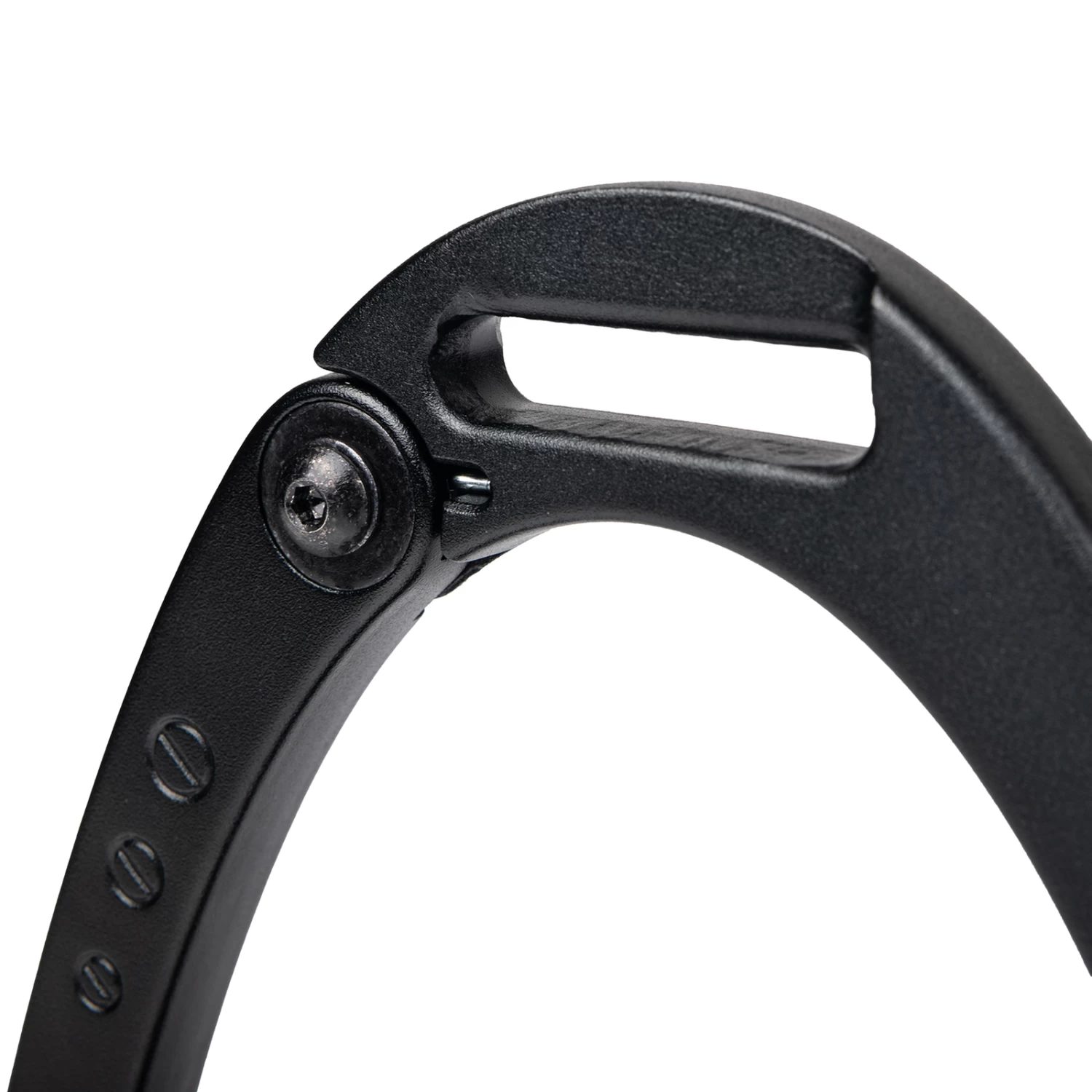Die Trittfläche wird durch ein Twin-Balance-Bogensystem gestützt, das das Gewicht gleichmäßig auf die Basis des Steigbügelrahmens verteilt. Der Scheitelpunkt des Rahmens ist vertieft und versetzt, was eine 45º-Ausrichtung nach außen fördert und es dem Reiter erleichtert, den optimalen Winkel für den Fuß zu finden und einen verlorenen Steigbügel wiederzufinden.